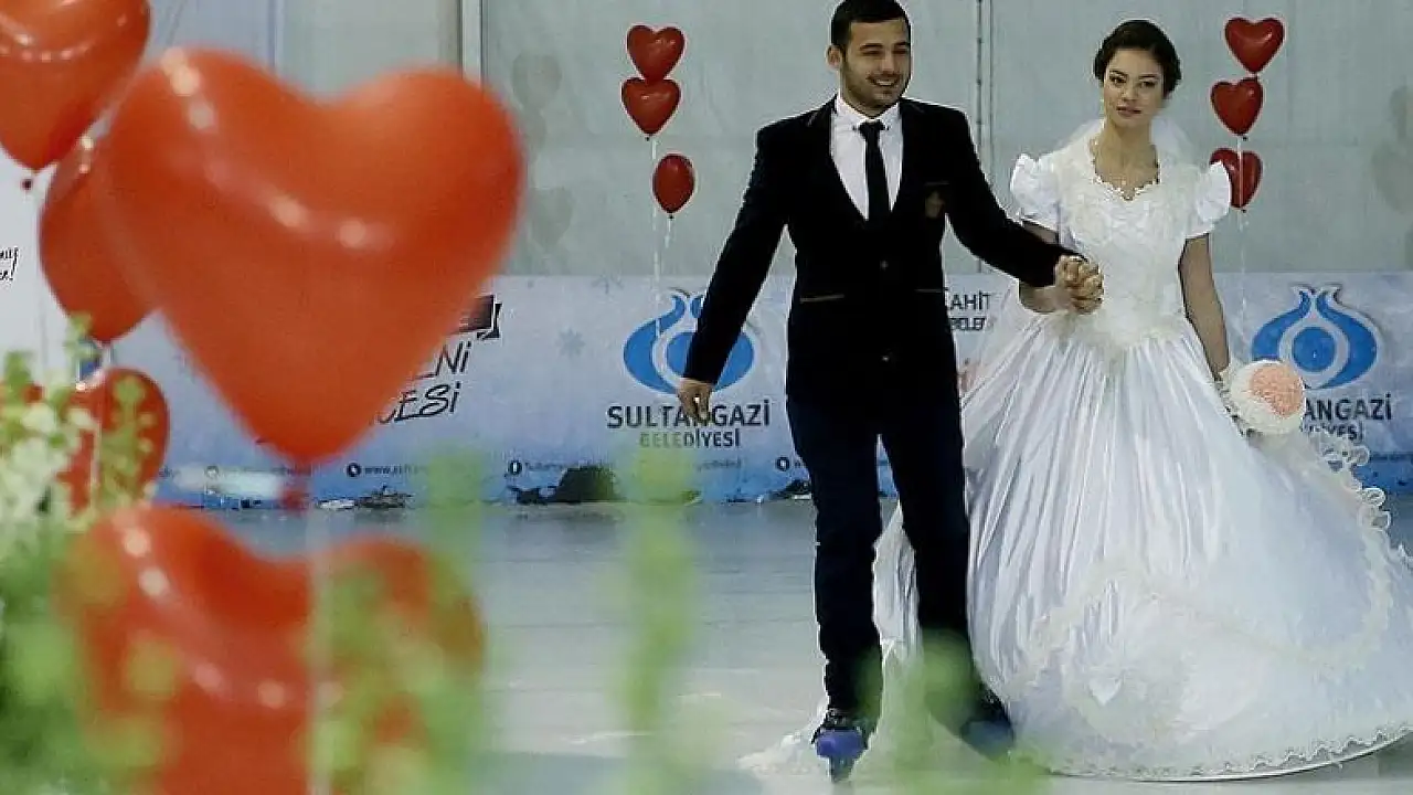 Sultangazi Belediyesi tarafından 14 Şubat Sevgililer Günü dolayısıyla 10 çiftin nikahı, belediyenin buz pistinde kıyıldı.