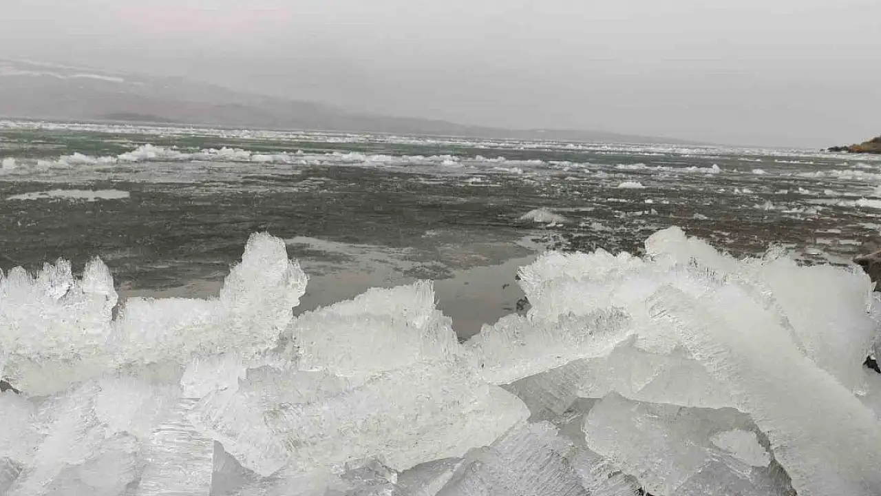 Ardahan'da Çıldır Gölü'nün yüzeyini kaplayan buz tabakası sıcak havanın etkisiyle erimeye başladı. Ortaya kutupları aratmayan görüntüler çıktı.