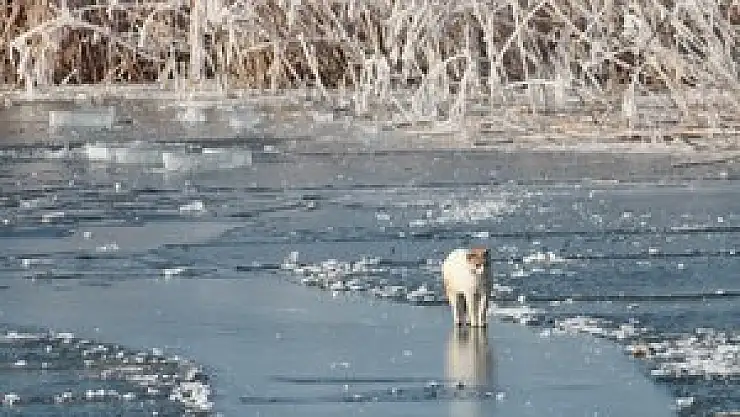Donmuş gölün üzerine çıkarak kıyılarda hareketsiz kalan balıkçı tekneleri yanındaki sazlıklar arasında gezinen kediler, yiyecek arayışına girdi. Su kuşlarının yaşam alanı olan sazlıklar arasında gezerek soğuktan ölmüş ördek aradıkları sanılan kediler, aç karınlarını doyurmak için çabalıyor.
