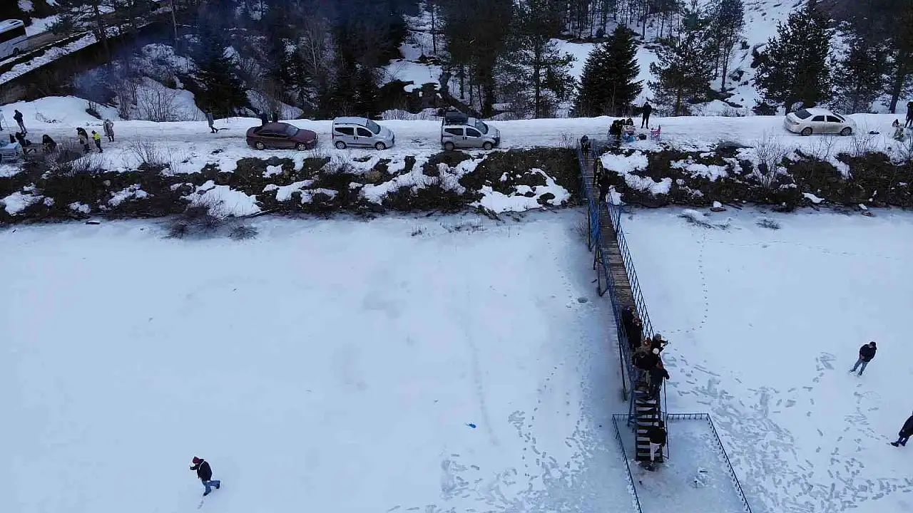 Bilecik'in Göletler Diyarı olarak bilinen Pazaryeri ilçesindeki Bozcaarmut Göleti etkili olan kar yağışı ve soğuk hava nedeniyle tamamen dondu. Buz tutan göledin üzerinde yürüyenler adeta tehlikeye davetiye çıkardı.