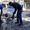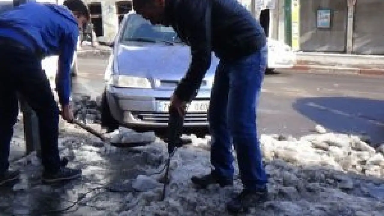 Sibirya soğuklarının etkili olduğu Kars'ta buz tutan kaldırımları kürekle temizleyemeyen vatandaşlar hiltiyle çözüm buldu.