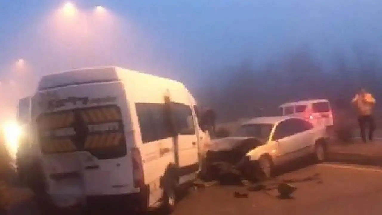 İşçi servisinin arkasından gelen 10 araç da duramayarak birbiriyle çarpıştı.