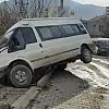 Buzlu yolda kayan minibüs askıda kaldı