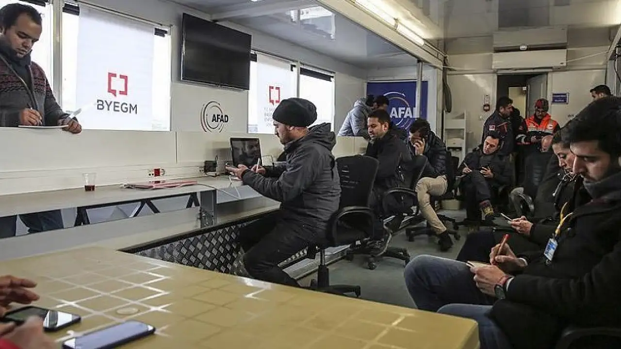 Hatay'ın Reyhanlı ilçesindeki Cilvegözü Sınır Kapısı'na getirilen mobil basın merkezindeki BYEGM görevlileri, ulusal ve uluslararası basın mensuplarının koordinasyonunun sağlanmasına yardımcı oluyor.