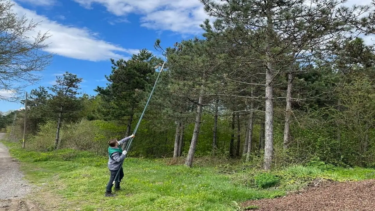 Düzce'nin Gölyaka ilçesi Orman İşletme Müdürlüğü sınırlarındaki ormanlarda karaçam ağaçlarına arız olan çam kese böceği ile mekanik ve biyolojik mücadele çalışmaları devam ediyor.