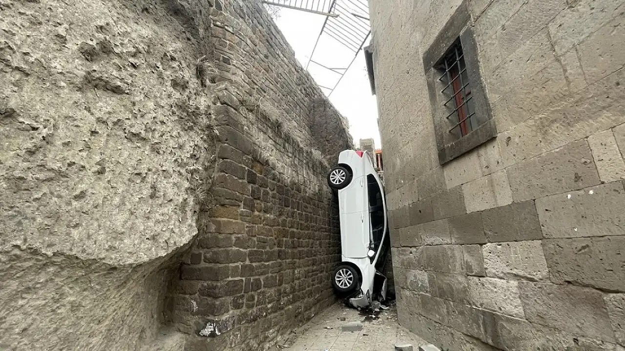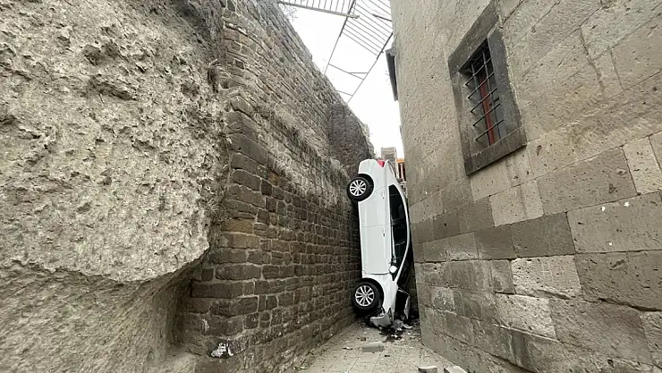 Cami ile istinat duvarı arasına dik şekilde düşen otomobildeki 3 kişi yaralandı