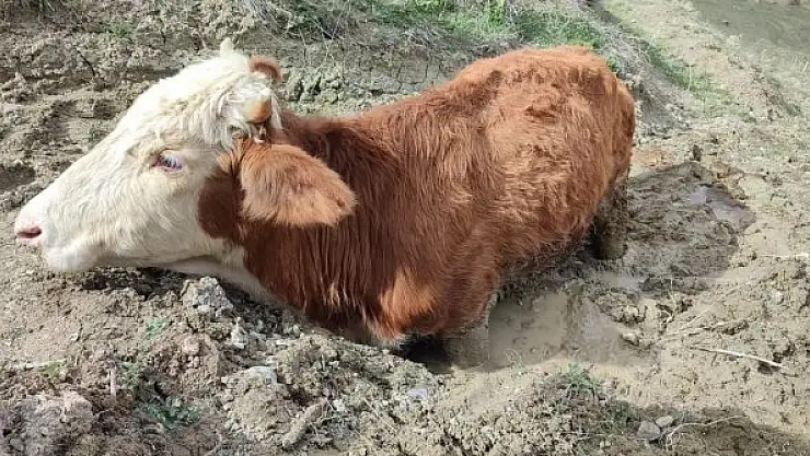 Çamura saplanan ineği vatandaşlar kurtardı