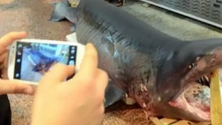 Küçükler, köpek balığını buraya sergilemek için getirdiklerini ifade ederek, "Boyu 3,63 metre, kilosu 700 kilogram. Bu Ege'den geldi. Ege'ye ait bir balık. 'Buraya müşteriler görsün' diye getirdik" ifadesini kullandı.