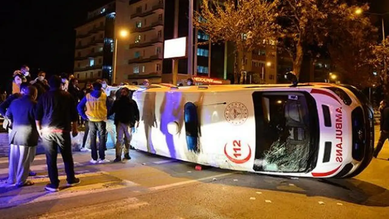 Devrilen ambulans, yaklaşık 100 metre sürüklendikten sonra durabildi.