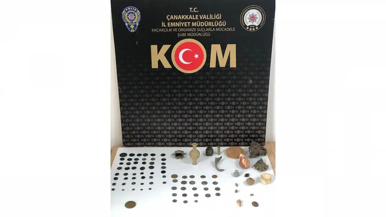 Çanakkale İl Emniyet Müdürlüğü Kaçakçılıkla Mücadele Şube Müdürlüğü (KOM) ekipleri, tarihi eser kaçakçılığıyla mücadele çerçevesinde Biga ilçesinde şüpheli M.I. ve M.B.'nin adresine operasyon düzenledi. Yapılan aramada, 47 adet üstünde figür ve yazılar bulunan sikke, 23 adet üstünde Arapça yazılar ve tuğralar bulunan sikke, 11 adet taş obje, testi şeklinde yaklaşık 10 cm uzunluğunda taş obje, 3 adet metal obje, üstünde figürler bulunan bir ucu açık metal obje, üstünde deniz kabuğu şekle olan kapaklı metal obje, Çanakkale Savaşından kaldığı değerlendirilen boş kovan, üstünde Atatürk 1881-1938 yazıları bulunan madalyon tarzı metal obje bulundu. Tarihi eserlere el konulurken, şüpheli M.I ve M.B hakkında 2863 Sayılı Kanun'a muhalefet suçundan adli işlem yapıldı.