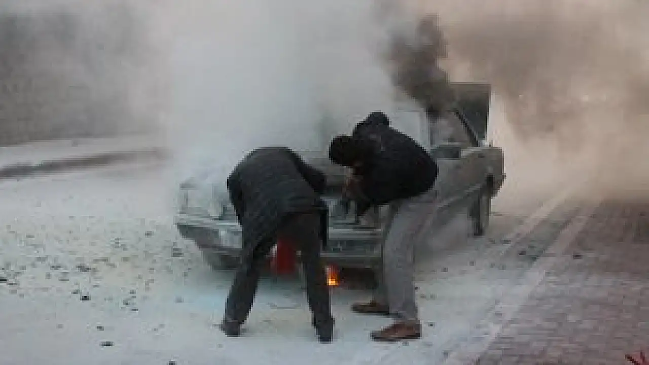 Konya'da bir şahıs kendini tehlikeye atarak hareket halindeyken yanan aracını yangın tüpü ile söndürmeye çalıştı.