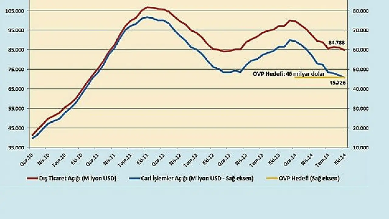 Türkiye'nin yıllıklandırılmış cari açığı 2014 yılı ekim ayında 45 milyar 726 milyon dolarla yaklaşık 4 yılın en düşük seviyesine gerileyerek, Orta Vadeli Program (OVP) 2014 yılı geneli için hedeflenen 46 milyar doların altına indi.