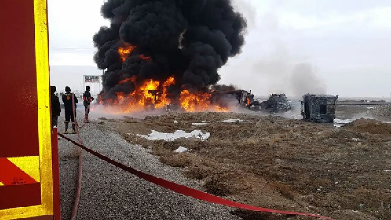 Konya'da akaryakıt taşıyan tanker ile kum yüklü kamyonun çarpışması sonucu alev alev yanan araçlardaki sürücüler hayatını kaybetti.