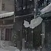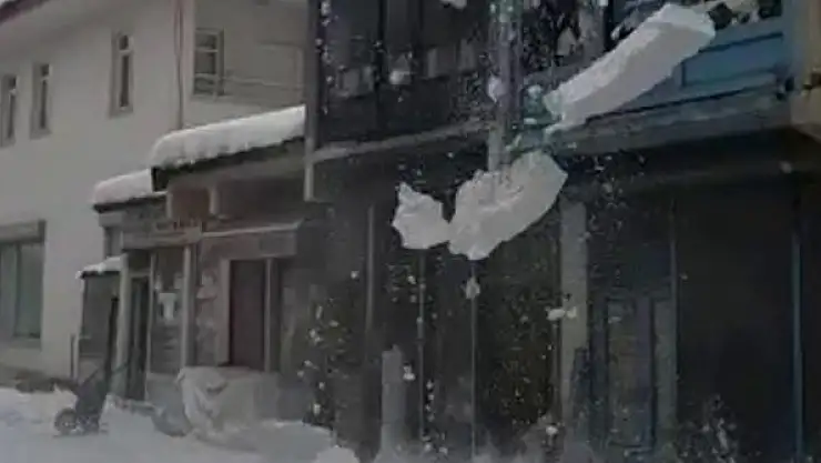AĞRI'nın Eleşkirt ilçesinde 2 katlı binanın çatısında biriken kar kütlesi caddeye düştü. O anlar cep telefonu kamerasıyla görüntülendi.