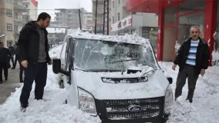 Muş'ta bir apartmanın çatısından düşen kar kütlesi, park halindeki aracın üzerine düşerek kullanılamaz hale getirdi.