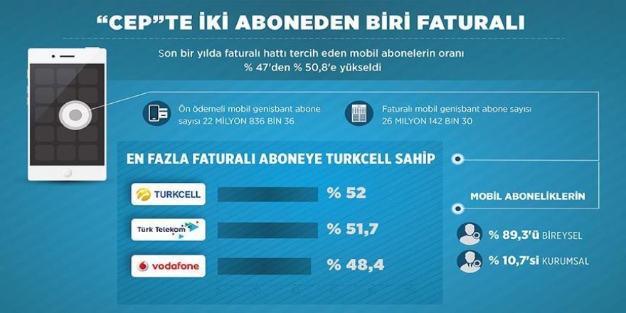 Son bir yılda faturalı hattı tercih eden mobil abonelerin oranı yüzde 47'den yüzde 50,8'e yükseldi.