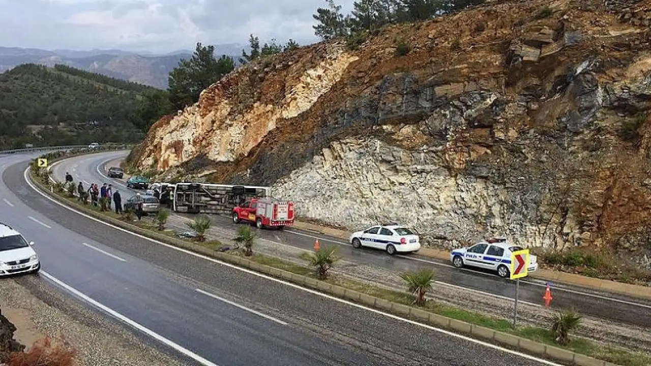 Türkiye Barolar Birliği Başkanı Metin Feyzioğlu'nun Anamur ilçesindeki programını takip etmek üzere Mersin kent merkezinden ilçeye giden çevik kuvvet polislerini taşıyan 33 D 3412 plakalı otobüs, Aydıncık ilçesi Gilindire Mağarası civarında aşırı yağışın da etkisiyle kayganlaşan yolda devrildi.