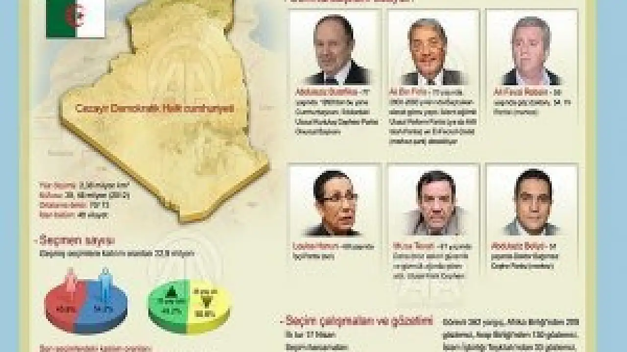 AA muhabirlerinin seçim merkezlerden aldığı bilgiye göre, Cumhurbaşkanı Abdulaziz Buteflika, diğer rakiplerine göre açık ara önde. Buteflika'nın, ikinci tura gerek kalmadan birinci turdan seçimi kazanarak dördüncü kez cumhurbaşkanı seçileceği belirtiliyor.