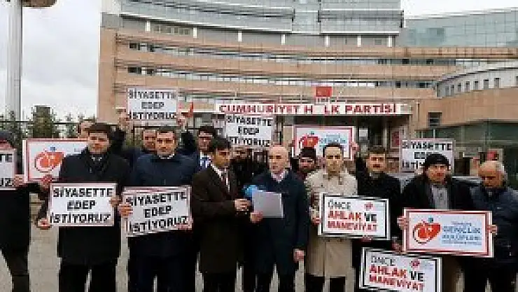CHP Genel Merkezi önünde toplanan konfederasyon üyeleri, "Siyasette edep istiyoruz", "Önce ahlak ve maneviyat" yazılı dövizler açtı.