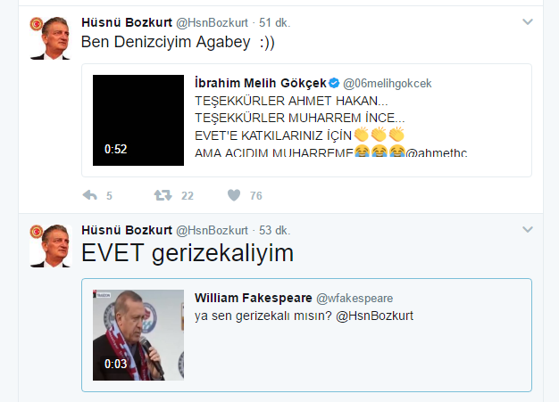 Halk oylamasında ’evet’ oyu verecekleri tehdit eden Hüsnü Bozkurt'un hesabından 'evet' tweetleri atıldı.