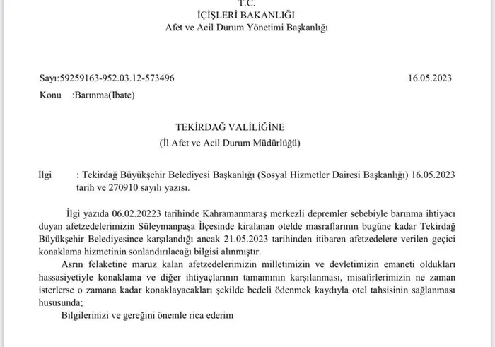Tekirdağ Büyükşehir Belediyesi barınma ihtiyaçlarını karşılamak için otele yerleştirdiği depremzedeleri, hiçbir gerekçe göstermeden otelden çıkardı, mağdur olan depremzedelere AFAD sahip çıktı.