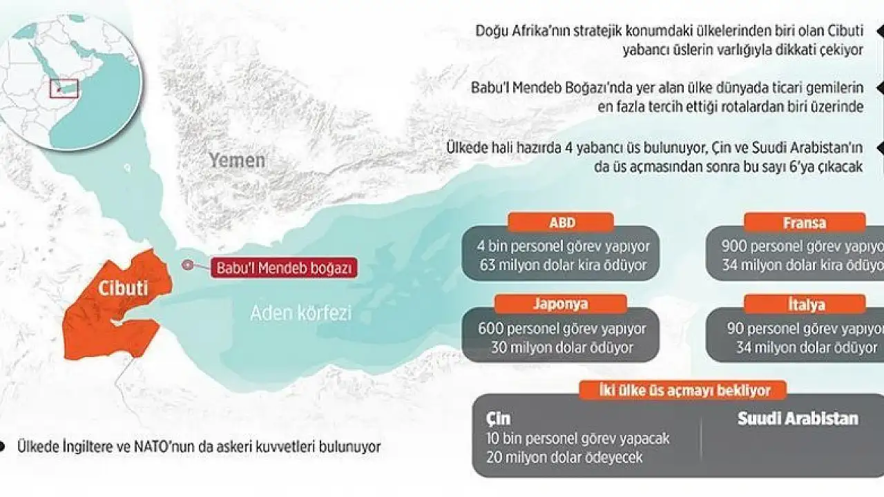 Akdeniz ile Hint Okyanusu'nu birbirine bağlayan Kızıldeniz-Aden Körfezi hattının geçiş noktası Babu'l Mendeb Boğazı'nda yer alan Cibuti'de hali hazırda Fransa, ABD, İtalya ve Japonya'nın askeri üssü bulunurken, Çin ve Suudi Arabistan da yakında Doğu Afrika ülkesinde üs açmayı planlıyor.