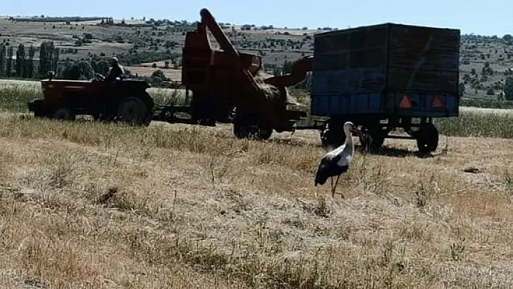 Leyleklerin biçerdöverle yapılan hasat sırasında tarladaki kaçışan böcekleri avlaması ilginç görüntüler oluşturdu.
