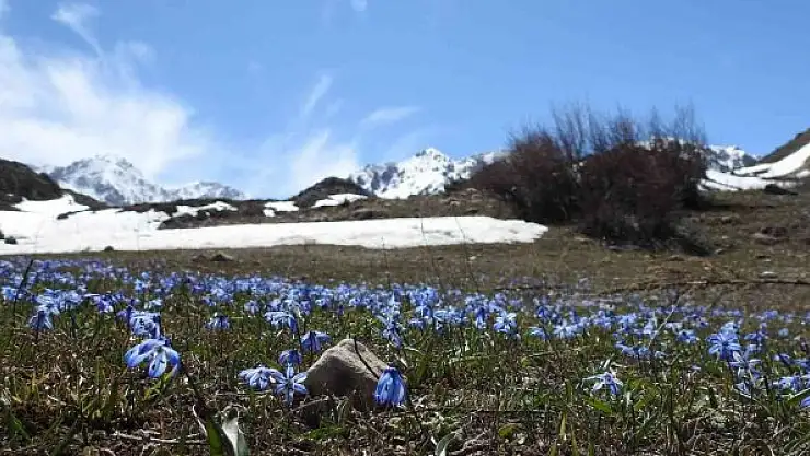 Erzincan'ın Çağlayan Beldesinde Munzur Dağının yamaçlarında karların eridiği alanlarda açan çiğdem ve nergisler kartpostallık manzaralar oluşturuyor.