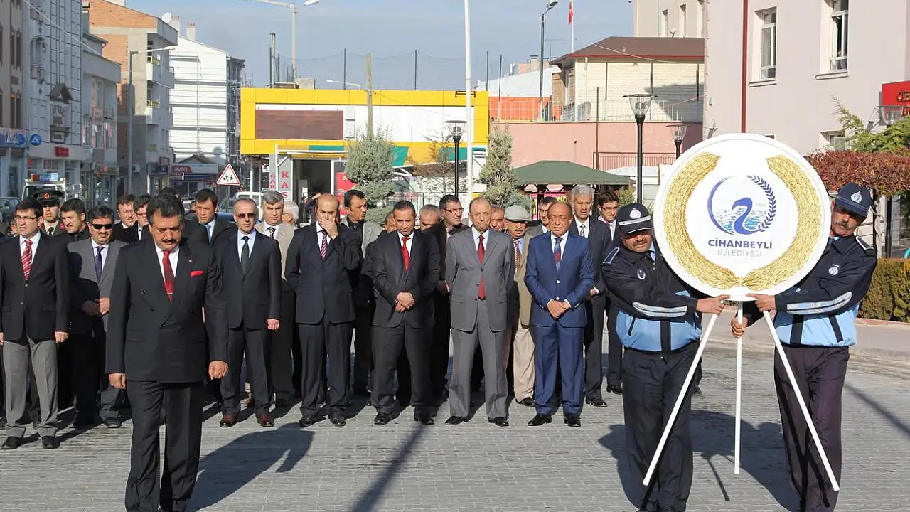 Atatürk Anıt'ına çelenklerin sunumu ile başlayan programa Cihanbeyli Kaymakamı Ahmet Gencer, Cihanbeyli Belediye Başkanı Mehmet Kale, Garnizon Komutanı Ömer Kaptan, Belediye Başkan Yardımcısı Mehmet Satılmış, daire amirleri, vatandaşlar ve öğrenciler katıldı. Çelenk sunumunun ardından 2 dakikalık saygı duruşunda bulunuldu ve müteakiben İstiklal Marşı okundu. İstiklal Marşı ve saygı duruşu ile birlikte göndere çekilen bayrak ile ilçedeki tüm bayraklar yarıya indirildi.