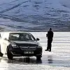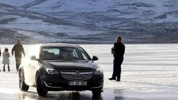 Ardahan'da, yüzeyi 20 santimetre buzla kaplanan Çıldır Gölü'nü ziyarete gelenler, otomobillerle yapılan drift gösterisini heyecan ve hayretle izledi.