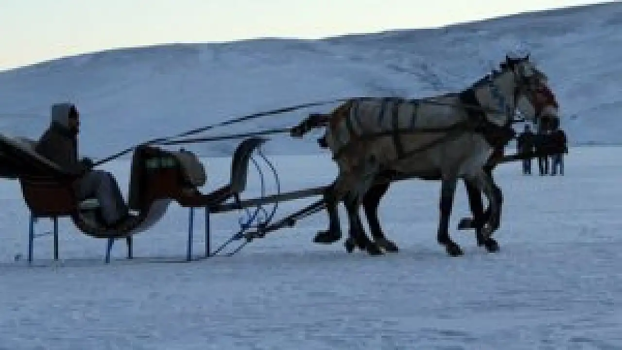 Doğu Anadolu Bölgesi'nin ikinci büyük gölü olan ve yüzeyi tamamen buzla kaplanan Çıldır Gölü'nde gezinmek isteyen yerli ve yabancı turistler, atlı kızaklara binerek göl üzerinde kızak yapma keyfi yaşıyor.