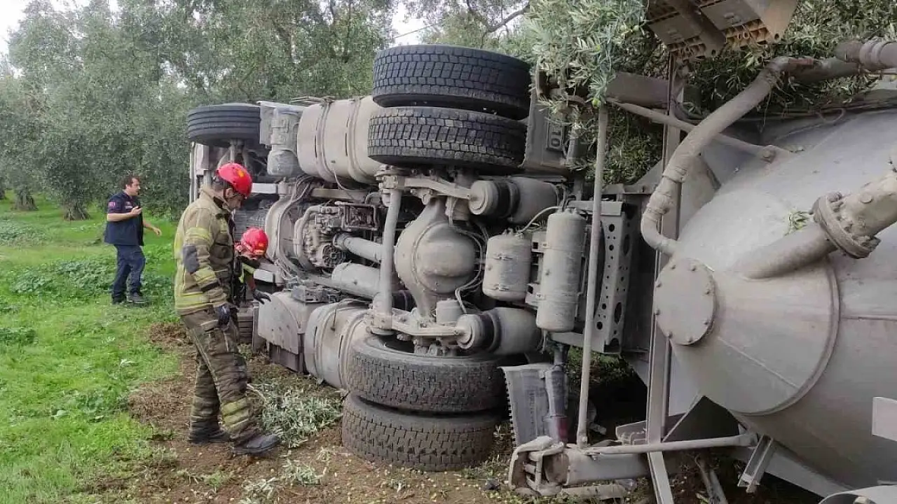 Bursa'nın Orhangazi ilçesi İznik yolu üzerinde çimento malzemesi yüklü bir tanker kontrolden çıkarak zeytinliğe devrildi.