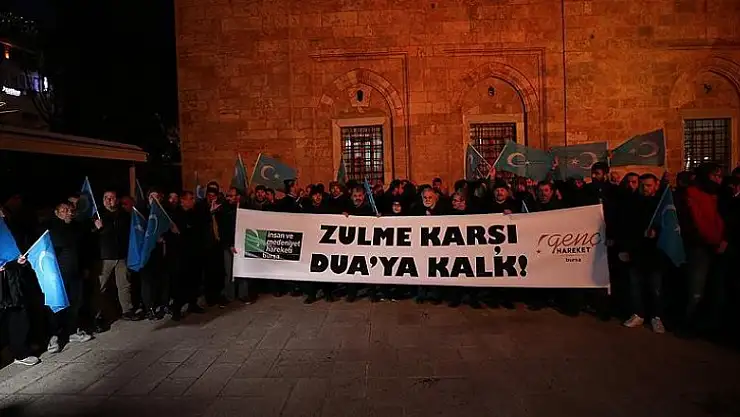 Bursa'da Ulu Cami'de kılınan sabah namazının ardından "Zulme Karşı Duaya Kalk" sloganıyla bir araya gelen ve ellerinde Doğu Türkistan bayrakları bulunan yaklaşık 100 kişilik grup, Çin yönetimine tepki gösterdi.