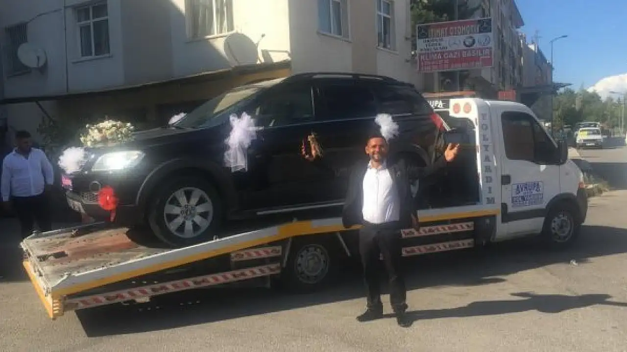 Gelin arabası olarak süslediği cipi arızalanınca, çağırdığı çekici üzerinde gelin almaya gitti. Cipin tamir edilmesinin ardından gelin alınıp düğün salonuna gidildi.