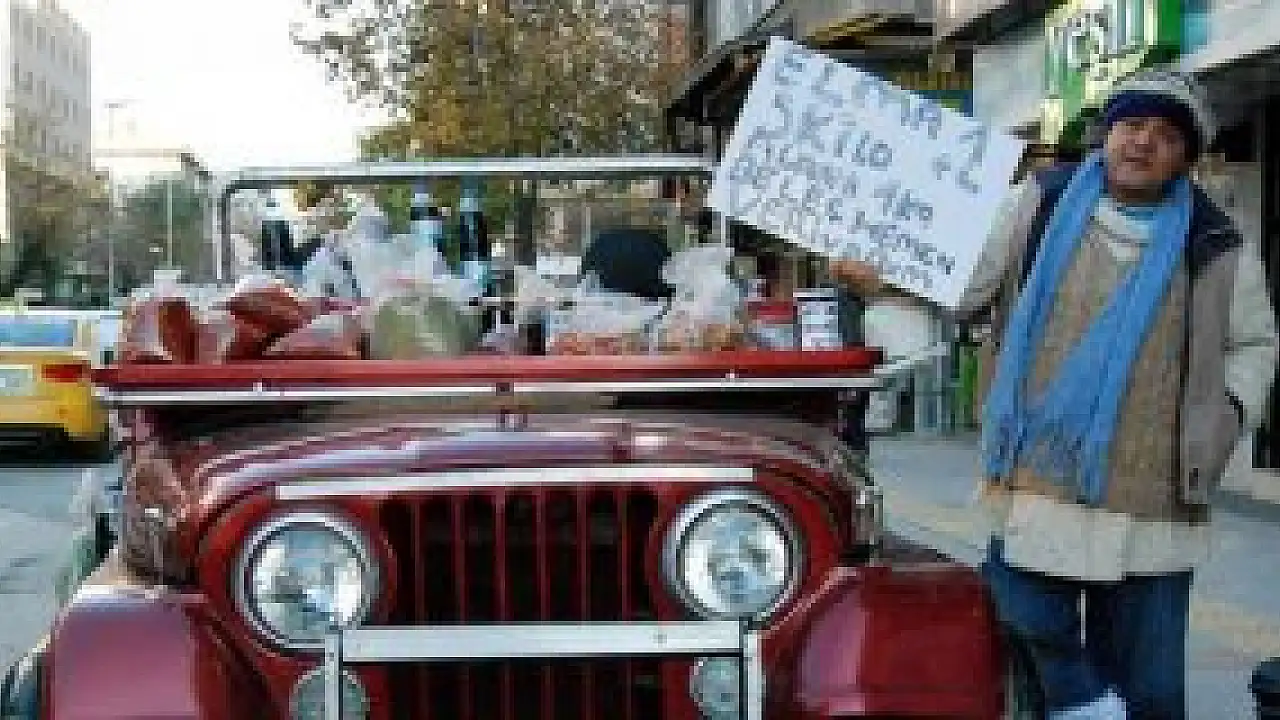 Gaziantep'te bir vatandaş 15 yıl önce aldığı ciple seyyar satış yapıyor. Cipe yüklediği pul biber, elma ve pekmezleri ile kapı kapı dolaşan Ömer Faruk Doğangül, mahallere ulaştığında ise elindeki düğü çalarak, geldiğini duyuruyor.