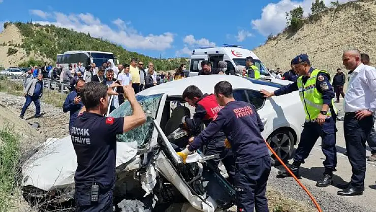 Antalya-Isparta kara yolunda ciple kafa kafaya çarpışan otomobilin motoru yola savruldu. Otomobilde sıkışan sürücüyü itfaiye kurtardı.