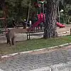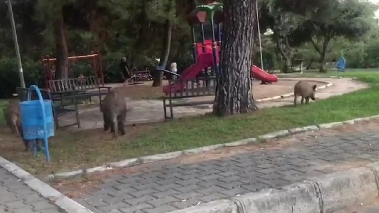 İzmir'in Bornova ilçesinde, çocukların oyun oynadığı esnada parka gelerek yiyecek arayan domuz sürüsü, bölgede bulunan site sakinlerini tedirgin ediyor.