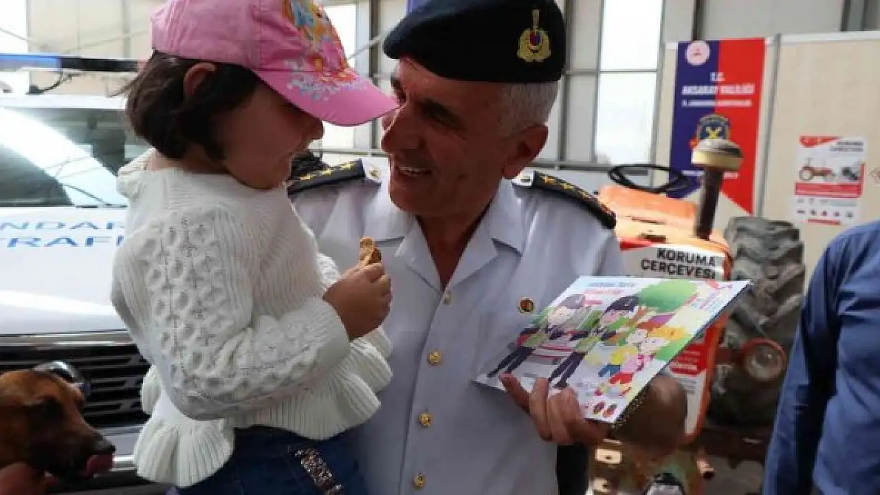 Aksaray'da düzenlenen 6. Uluslararası Tarım ve Hayvancılık Fuarı'nda jandarma standında çocuklara kitap dağıtan İl Jandarma Komutanı Hacı Ali Büber, jandarmanın faaliyetlerini anlattı.