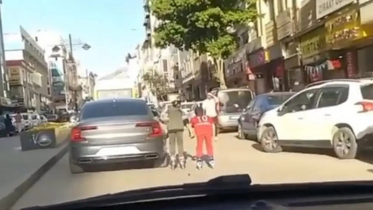 Van'da trafiğin en yoğun olduğu ve en işlek caddelerden biri olan Maraş Caddesinde hareket halindeki otomobilin arkasına tutunarak paten kayan iki çocuk korku dolu anlar yaşattı. Hareket halindeki bir otomobilin arkasına tutunan patenli iki çocuğun tehlikeli şekildeki yolculuğu kameralara yansıdı.