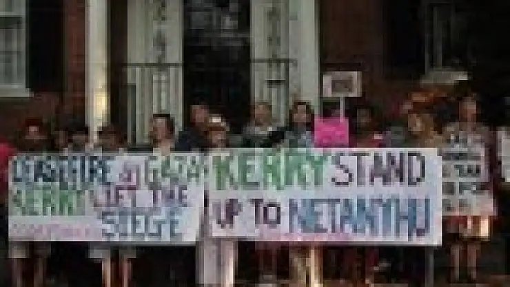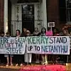 Codepink üyesi yaklaşık 30 kişilik grup, akşam saatlerinde Dışişleri Bakanı Kerry’nin Georgetown’daki evi önünde toplandı. Grup, “Kerry, Netanyahu’ya karşı dik dur”, “Savaşı durdurun” yazılı pankart açarken, “Ölümleri sonlandırın”, “Gazze’ye ablukayı kaldırın”, “Özgür Filistin” sloganları attı.