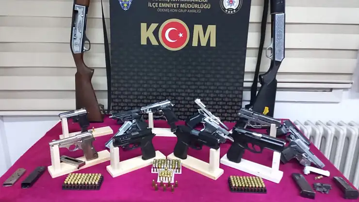 İZMİR'in Ödemiş ve Kiraz ilçesinde, polis ekiplerince düzenlenen operasyonda kurusıkıdan bozma 13 tabanca ve 2 tüfek ele geçirildi, 3 şüpheli gözaltına alındı.