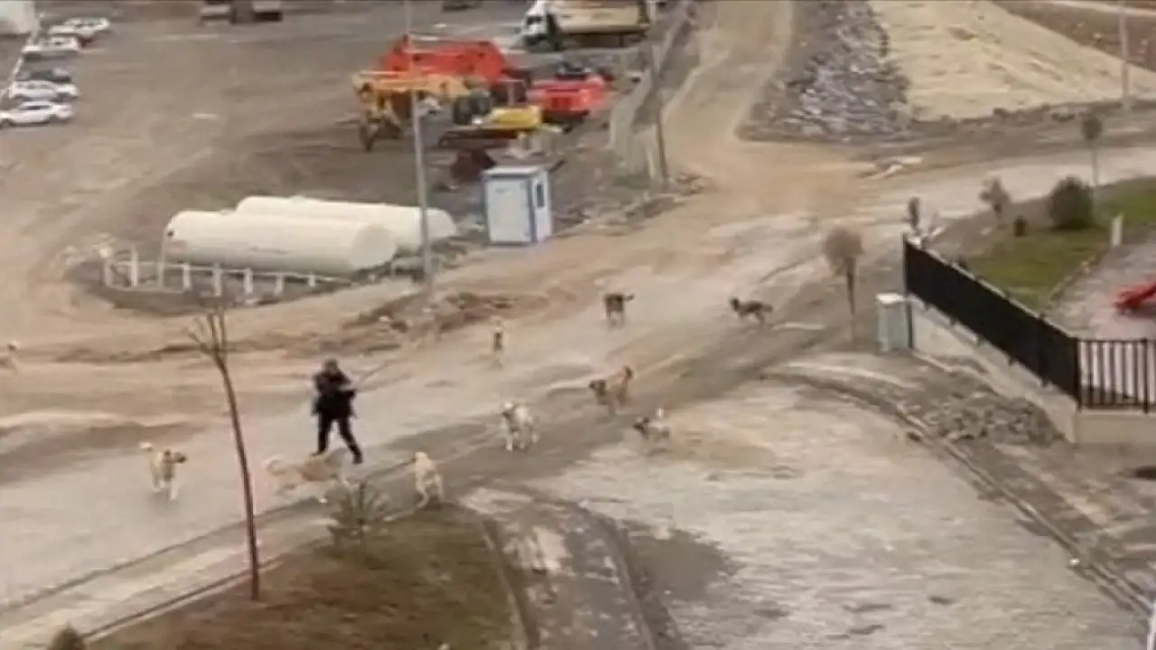 Şahsın köpek saldırısından kurtulmayı başardığı anlar, balkonunda çevreyi izleyen Mehmet Penek tarafından cep telefonuyla kaydedildi.