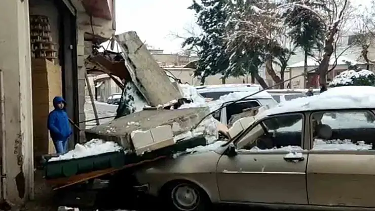 Şanlıurfa'da kar yağışı sonrası çöken tentenin altında kalan araçlar hasar gördü.