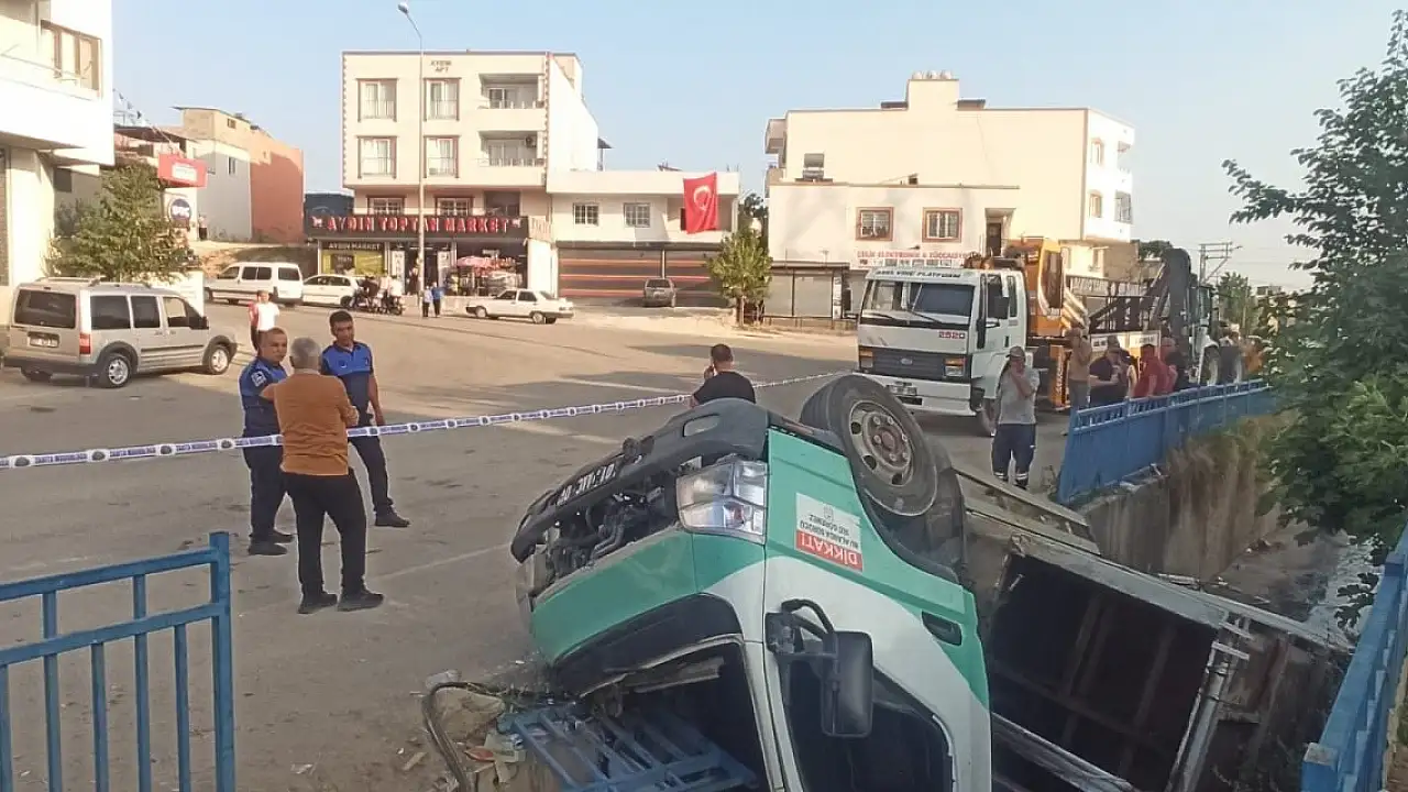 Sürücüsünün kontrolünden çıkan belediyeye ait çöp kamyonu, sulama kanalına devrildi. Kazada 3 kişi yaralandı.
