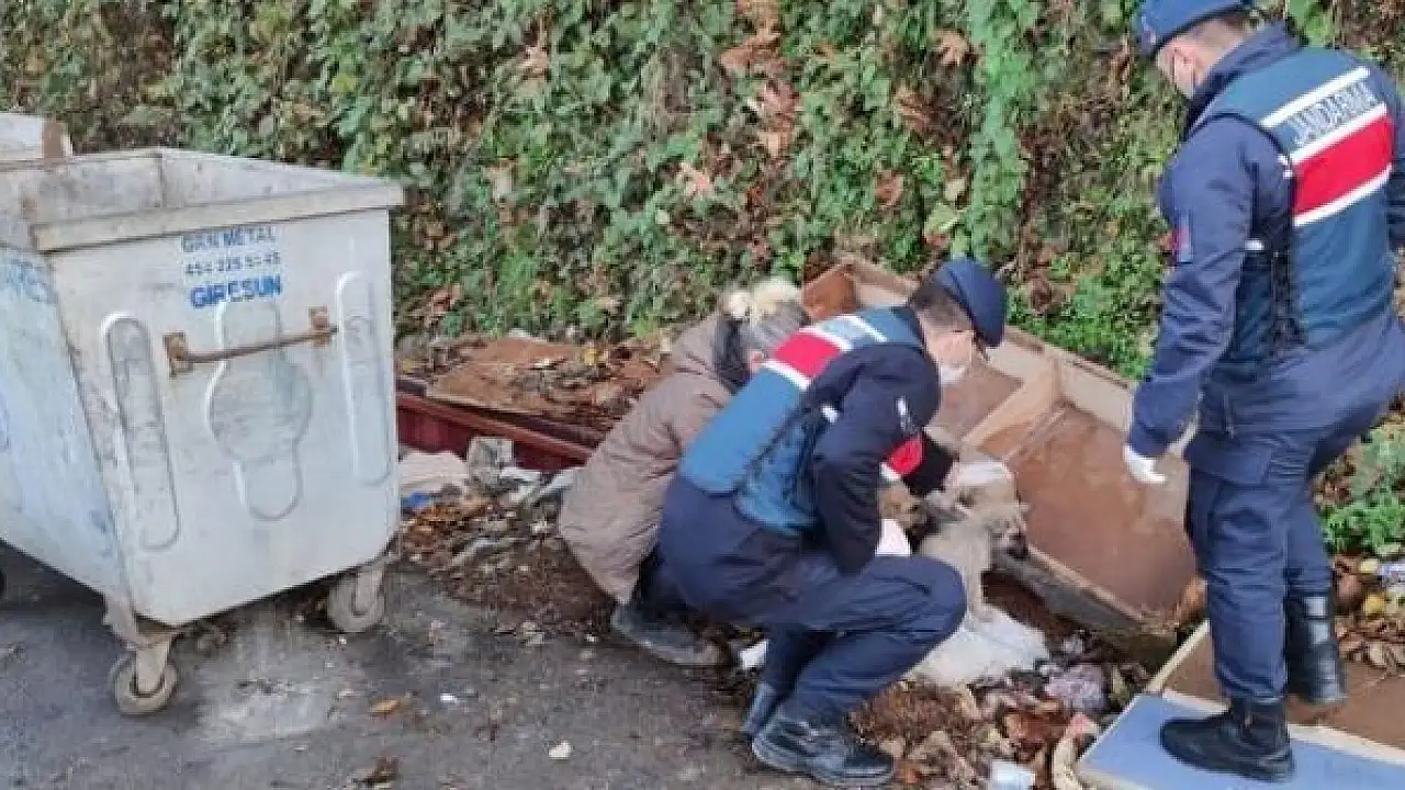 Giresun'da çöp konteynerinin yanına bırakılan 4 köpek yavrusunu, jandarma ekipleri hayvan barınağına götürdü.