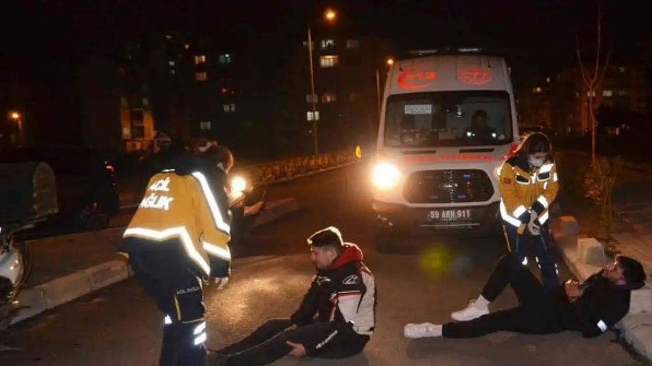 Kaza, gece saatlerinde Kazımiye Mahallesi Şahinkaya Caddesi'nde meydana geldi. Edinilen bilgiye göre, Salih Omurtak Caddesi yönüne seyreden bir motosiklet, sürücüsünün direksiyon hakimiyetini kaybetmesi sonucu virajda yol ayrımında devrildi. Kaza sonrası yaralanan motosiklet sürücüsü ve arkasında bulunan arkadaşına ilk müdahaleyi sağlık ekipleri yaptı. Yaralı iki genç, tedavisi için ambulansla Çorlu Devlet Hastanesi'ne kaldırıldı.