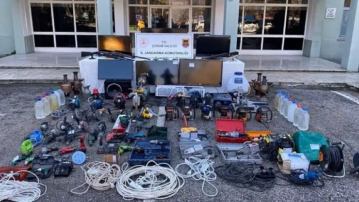 Edinilen bilgiye göre, bağ, bahçe, tarla ve evden hırsızlık olaylarının önlenmesi, meydana gelen hırsızlık olaylarının faillerinin tespit edilerek yakalanması maksadıyla oluşturulan özel ekipler tarafından yürütülen çalışmalar sonucunda, tespit edilen depo ve iş yerine düzenlenen operasyonlarda, geçmiş dönemlerde Çorum İl Merkez ile Mecitözü ilçelerinde meydana gelen 20, merkez ilçe Polis Bölgesi ve Amasya ilinde meydana gelen toplam 22 hırsızlık olayında çalındığı belirlenen; 6 adet televizyon, 3 adet av tüfeği, 138 adet 9 milimetre çapında tabanca fişeği, 8 adet motorlu testere, 2 adet kaynak makinası, 7 adet elektrikli el matkabı, 8 adet şarjlı vidalama/matkap cihazı, 2 adet şarjlı matkap şarj aleti, 4 adet şarjlı matkap bataryası, 9 adet spiral makinası, 5 adet plastik boru kaynak makinesi, 1 adet dairesel tezgah testeresi, 5 adet hidrofor motor, 2 adet dalgıç pompa, 1 adet dekupaj testere, 2 adet kılıç testere, 4 adet bakır semaver, 1 adet bakır güğüm, 1 adet fayans kesme makinası, 1 adet sırt tipi ilaçlama makinası, 1 adet el yapımı pala bıçak, 6 adet seyyar uzatma kablosu ile 92 litre kaçak rakı ele geçirildi.