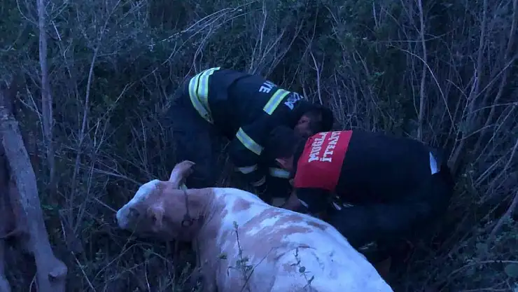 Muğla'nın Seydikemer ilçesinde çukura düşen inek, ekipler tarafından kurtarılarak sahibine teslim etti.