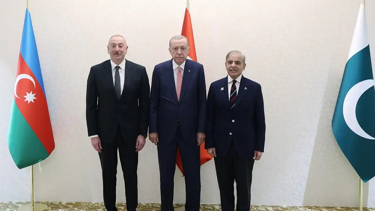 Cumhurbaşkanı Erdoğan, Azerbaycan Cumhurbaşkanı İlham Aliyev ve Pakistan Başbakanı Şahbaz Şerif ile bir araya geldi. Toplantının başında Cumhurbaşkanı Erdoğan ile Aliyev'in samimi diyaloğu kameralara yansıdı.