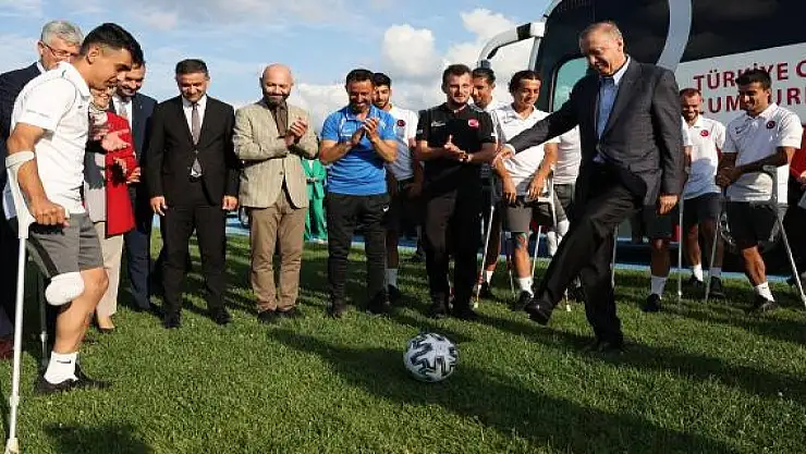 Cumhurbaşkanı Erdoğan, "Sanayi ve Teknolojinin Merkezi Kocaeli'ye Değer Katanlar Ödül Töreni" ile "TOKİ Konutları, KYK Yurtları, Büyükşehir Belediyesi Yatırımları ve Fabrikaları ile Yapımı Tamamlanan Diğer Projelerin Toplu Açılış Töreni" için geldiği Kocaeli'de, kamp yapan Ampute Milli Futbol Takımına ziyarette bulundu.
